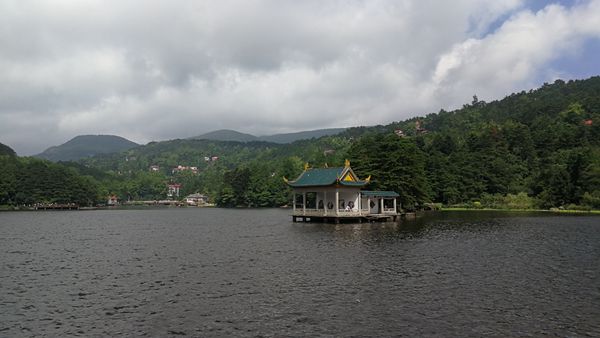 第二站,我們來到瞭(le)遠看景似油畫般的蘆林湖。湖面清澈,碧清如鏡,湖心亭外觀秀麗、精巧,爲湖面增光不少。湖水在陽光的映射下似發光的碧玉鑲嵌在林蔭秀谷之中,缥缈雲煙襯(chèn)托之下,猶如天上人間。